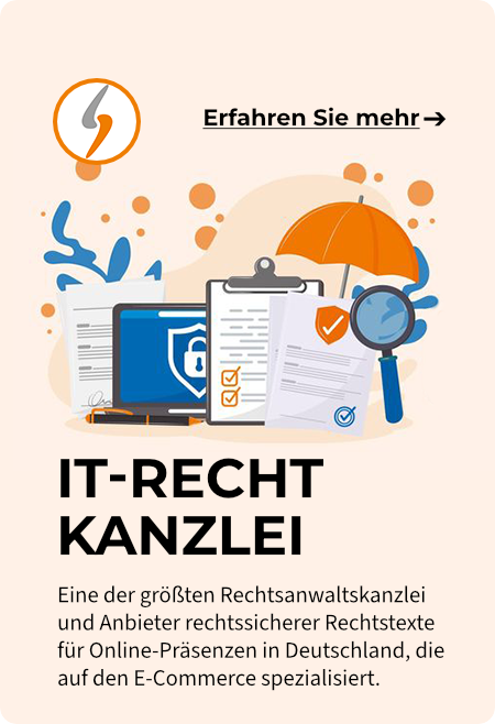 Die IT-Recht Kanzlei ist eine auf den E-Commerce spezialisierte Rechtsanwaltskanzlei mit Sitz in München. Sie ist eine der größten Anbieter von nationalen und internationalen Rechtstexten für Internetpräsenzen. Zudem betreibt die Kanzlei eines der frequentiertesten Rechtsportale Deutschlands. Die IT-Recht Kanzlei bietet einen automatisierten Update-Service für Händler. Das bedeutet dauerhaft aktuelle und v.a rechtssichere Rechtstexte - mit maximal einfachem Handling: Über Schnittstellen mit den gängigsten Shopsystemen wird die Aktualisierung der Rechtstexte vollautomatisiert. Zudem können Mandanten u.a. auf zahlreiche Muster, Handlungsanleitungen und interessante Service-Angebote rund um das Thema E-Commerce zugreifen.