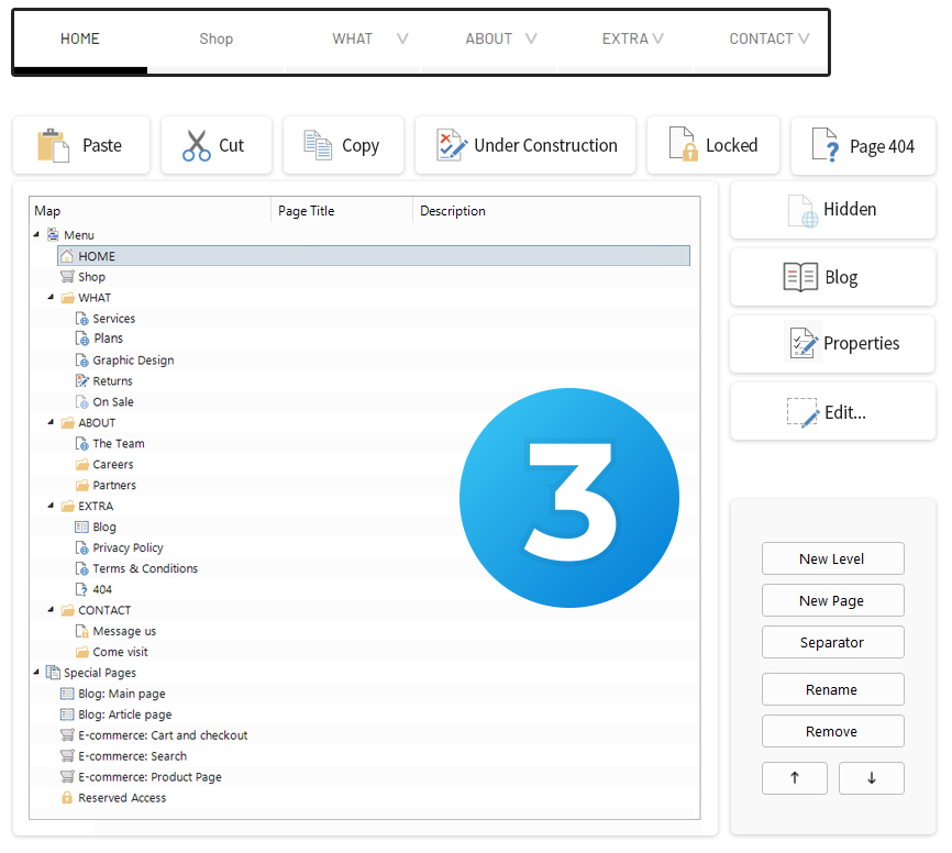 Trabajando en el mapa puede hacer muchas cosas: volver una página invisible, protegerla con contraseña, configurarla como página 404, etc.