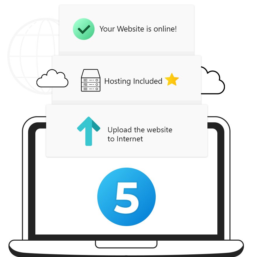 WebSite X5 es un proceso guiado: siga el intuitivo procedimiento en 5 pasos para transformar su idea en un sitio web terminado y publicado online.