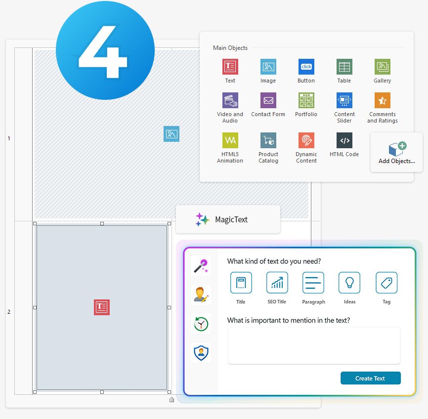 Avec les Objets, vous pouvez importer ou créer n'importe quel type de contenu : textes, images, galeries, vidéos, formulaires, champs de recherche, etc. Quel que soit votre besoin, nous avons l'objet qu'il vous faut.