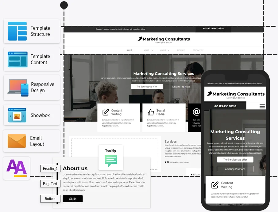 WebSite X5 tem um sistema exclusivo de layout de página: com o Arraste & Solte você sempre trabalha de forma visual e nunca tem que mexer no código.