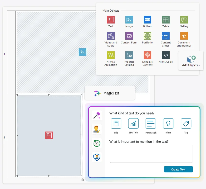 Escrever nunca foi tão fácil: MagicText, o assistente de geração de texto baseado em IA, ajudará você a encontrar novas ideias e as palavras certas para criar o conteúdo do seu site.
