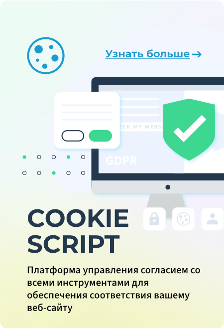 Cookie Script — это комплексное решение, настоящая платформа со всеми инструментами, необходимыми для обеспечения соответствия вашего сайта последним правилам конфиденциальности (GDPR, CCPA, LGPD, CNIL). Он доступен более чем на 30 языках, и его уже выбрали более 200 000 клиентов по всему миру. Включает интеллектуальные функции, такие как: сканер файлов cookie, автоматическая категоризация файлов cookie, автоматическая блокировка сторонних файлов cookie.