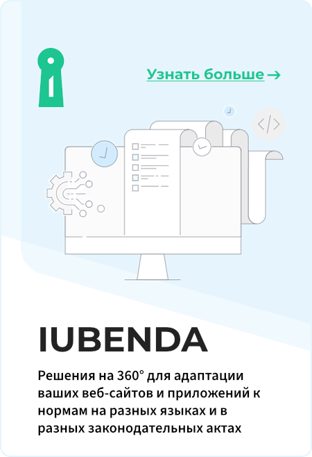 Iubenda — это комплексное решение, которое позволяет вам привести сайты и приложения в соответствие с законодательством на нескольких языках и в различных законодательных актах, с помощью удаленных и автоматических обновлений, управляемых международной командой юристов. Он обслуживает более 130 000 клиентов из более чем 100 стран, от крупных предприятий до новых стартапов. Услуги включают в себя генератор политик конфиденциальности и файлов cookie с более чем 1600 положениями и решениями для файлов cookie, внутренней конфиденциальности и управления согласием.